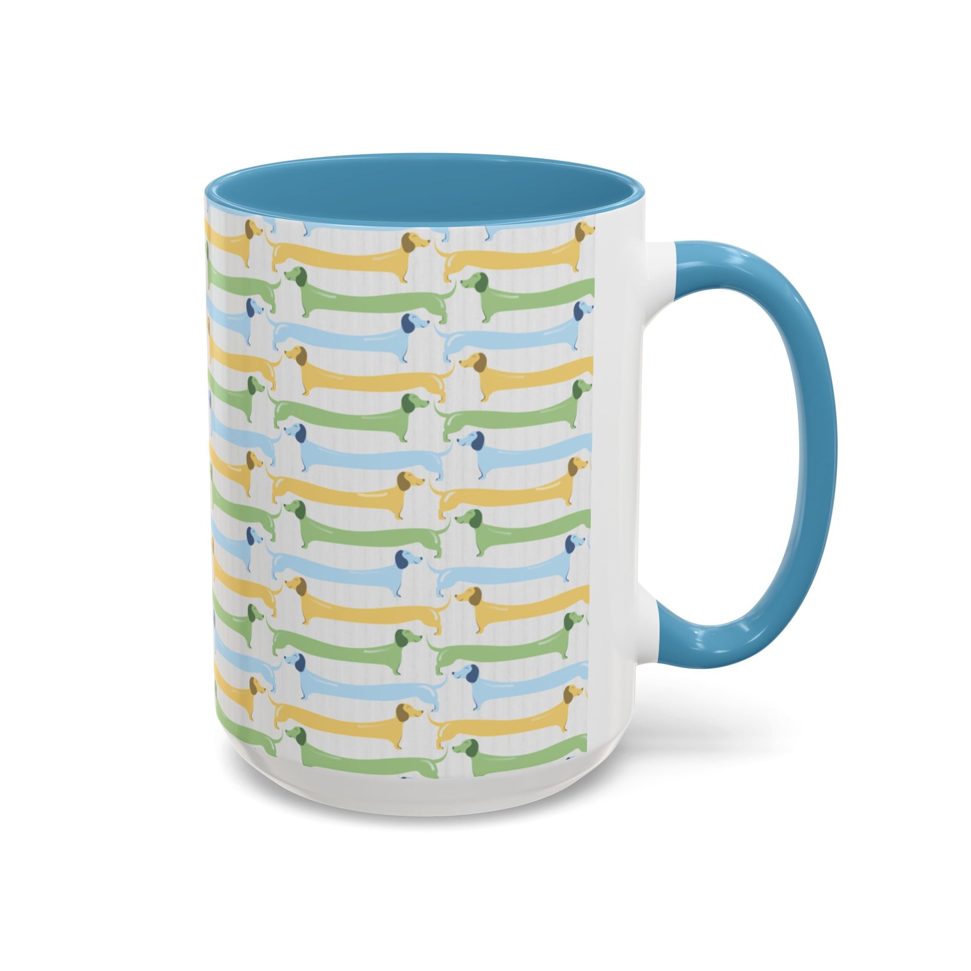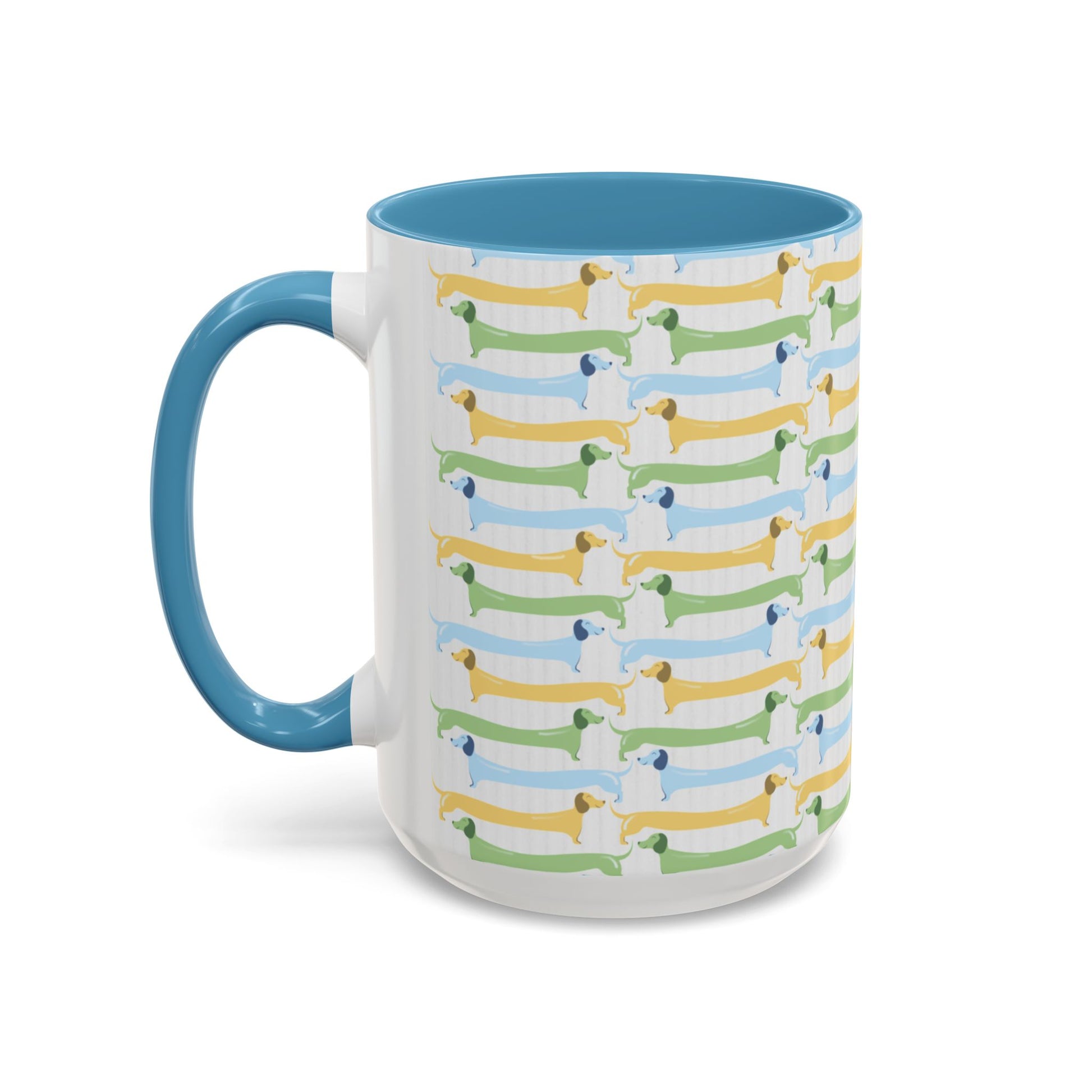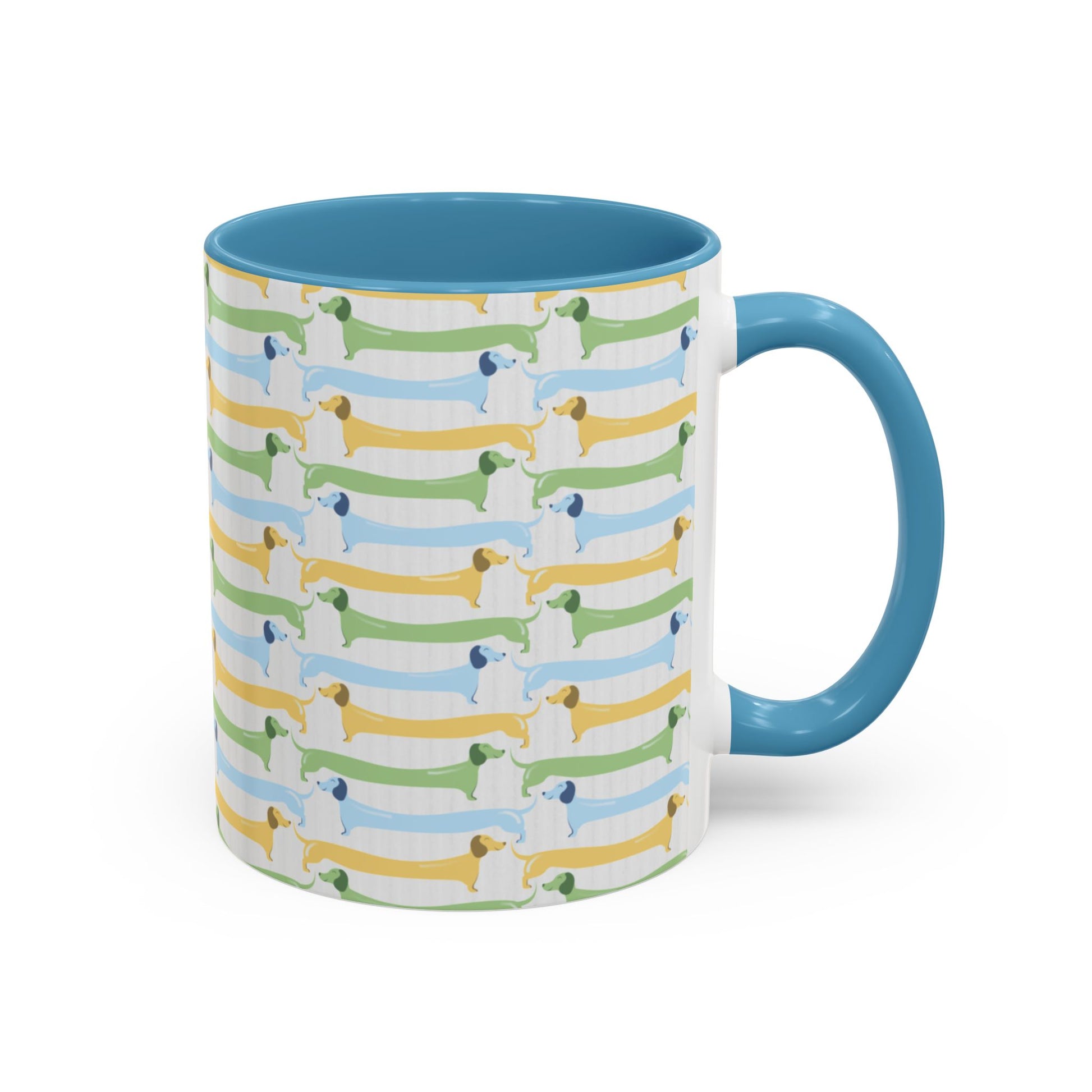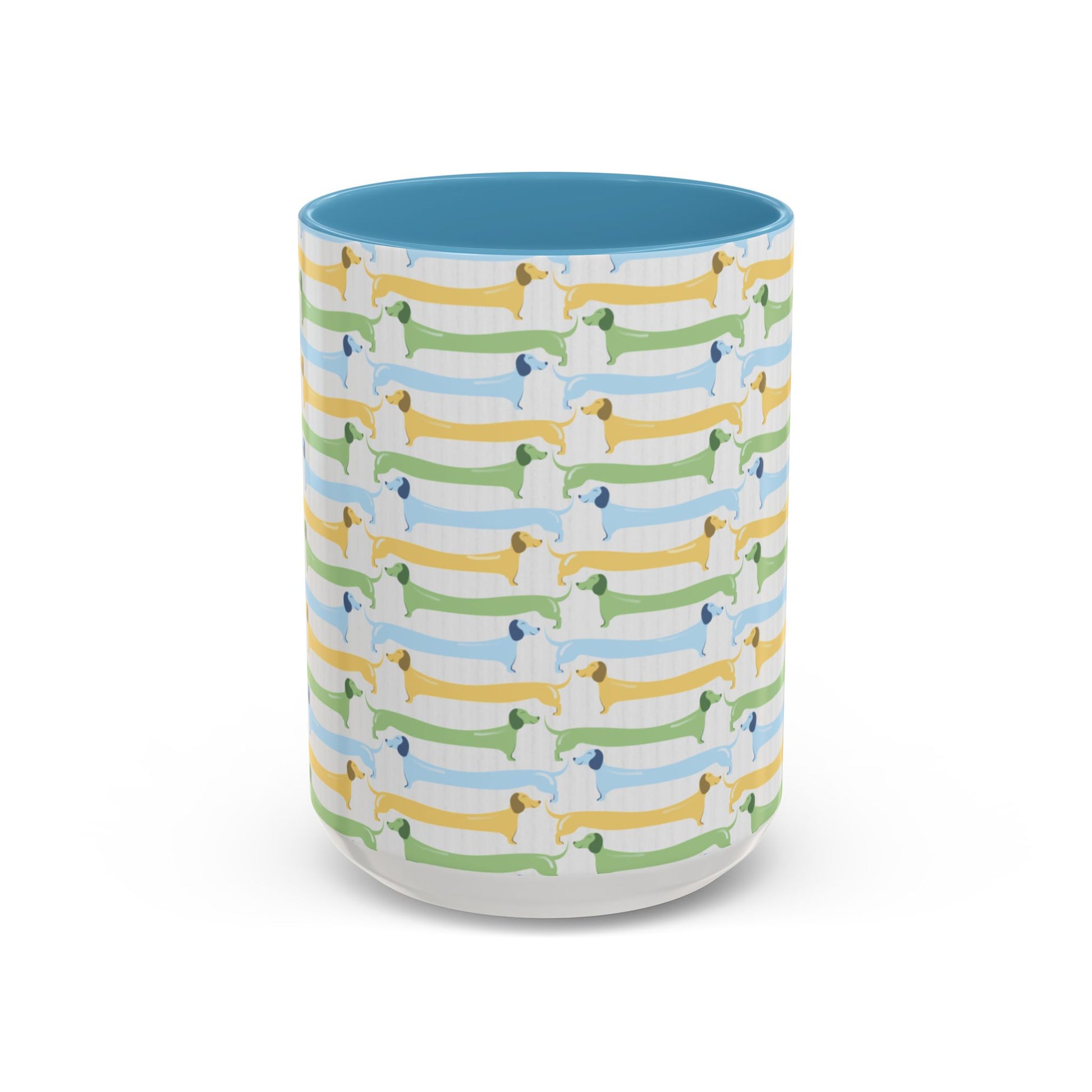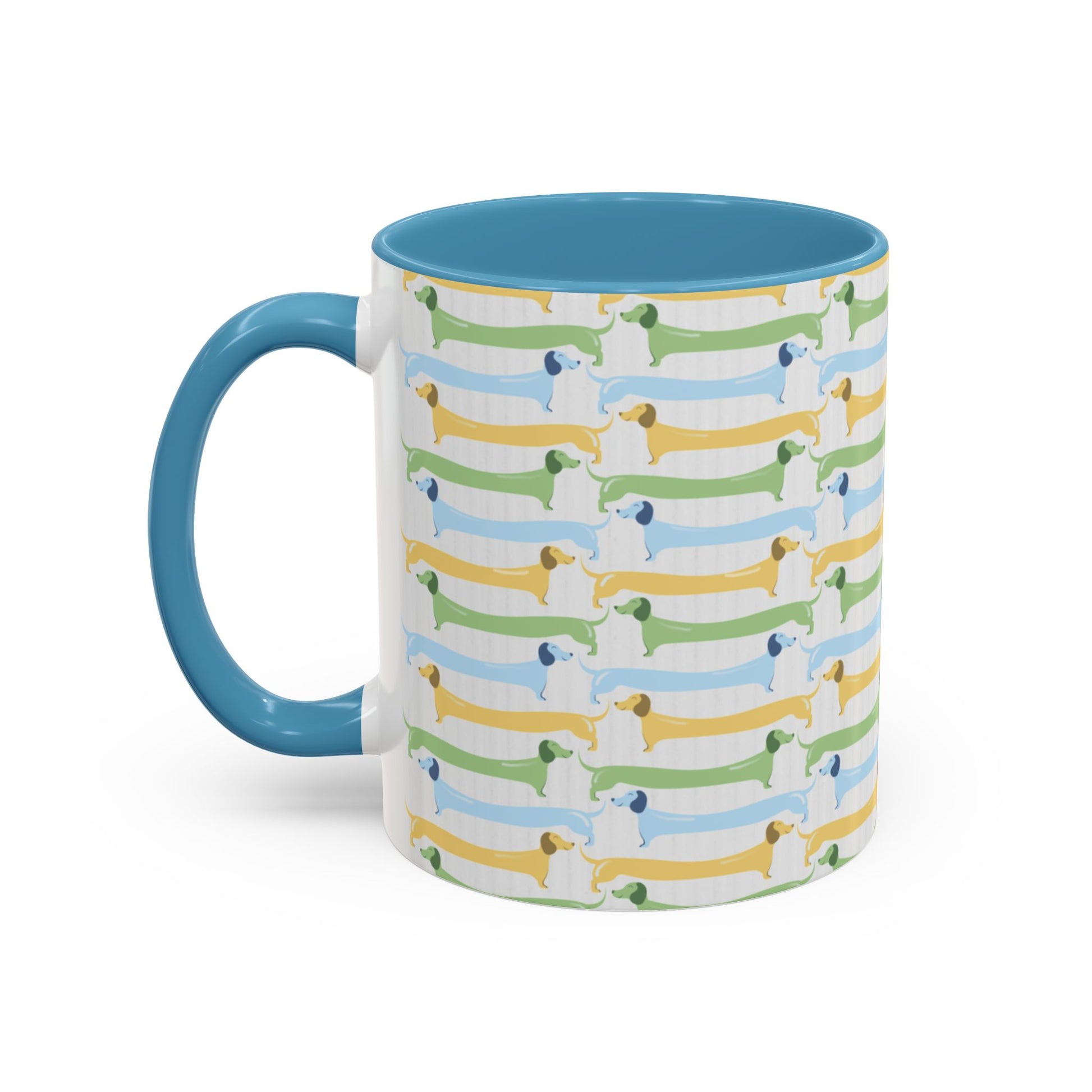 This dachshund mug is perfect for dog lovers who enjoy their morning coffee with a touch of cuteness. The vibrant colors and eye-catching design will brighten up your day. Ideal for animal lovers and pet owners, this mug is a great gift for birthdays, holidays, mothers day, and special occasions. doxie, ween, weenie, wiener, doxy blue, yellow, green