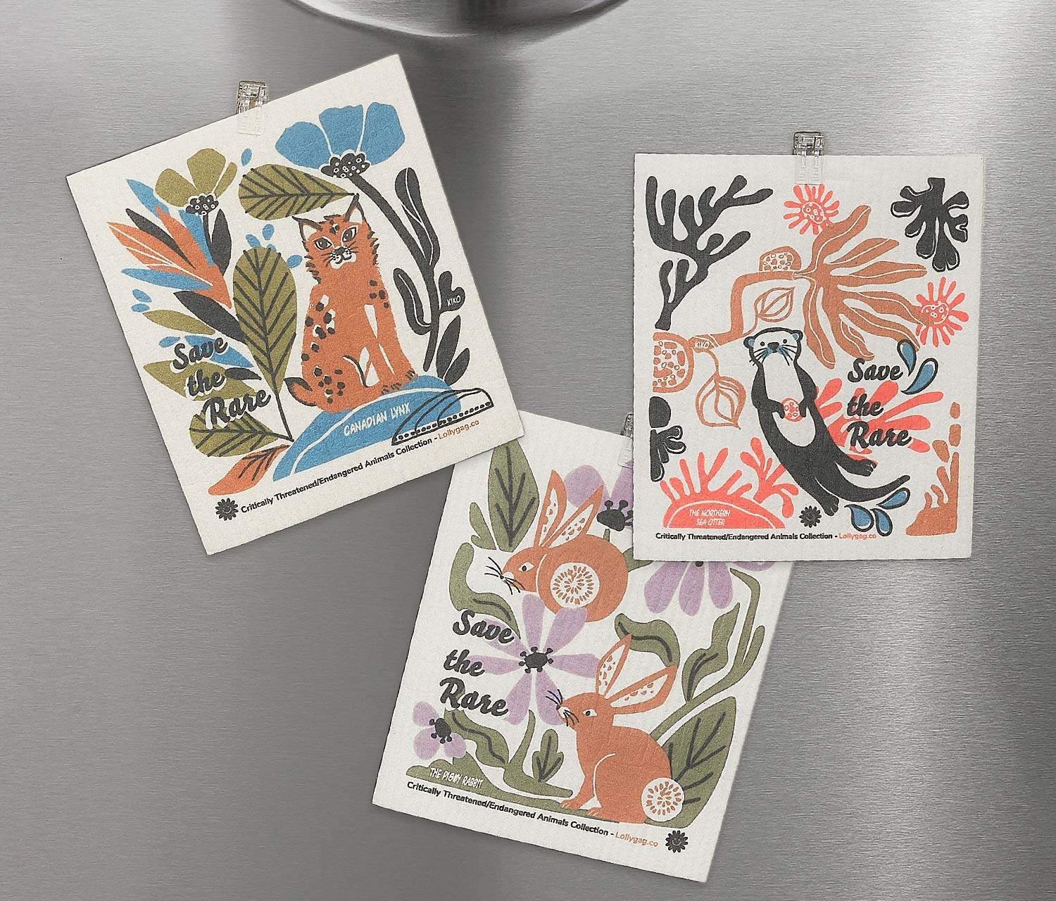 Each cloth celebrates the beauty of our Pacific Northwest and highlights some of its most critically threatened and endangered furry friends.