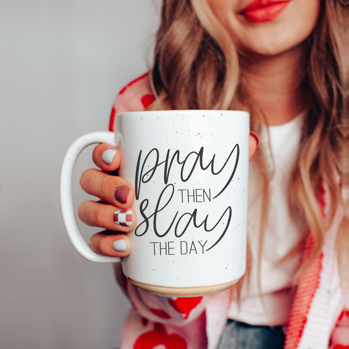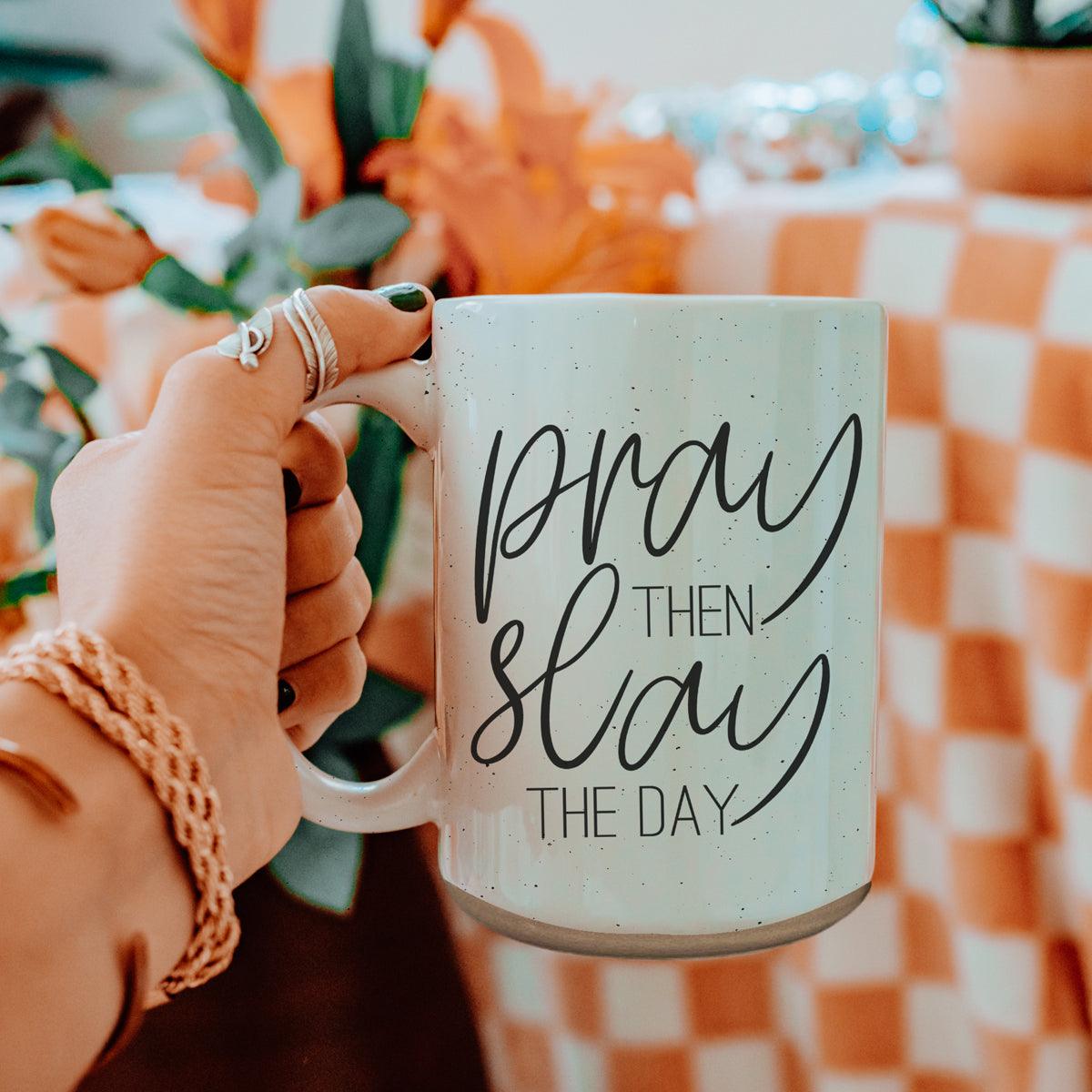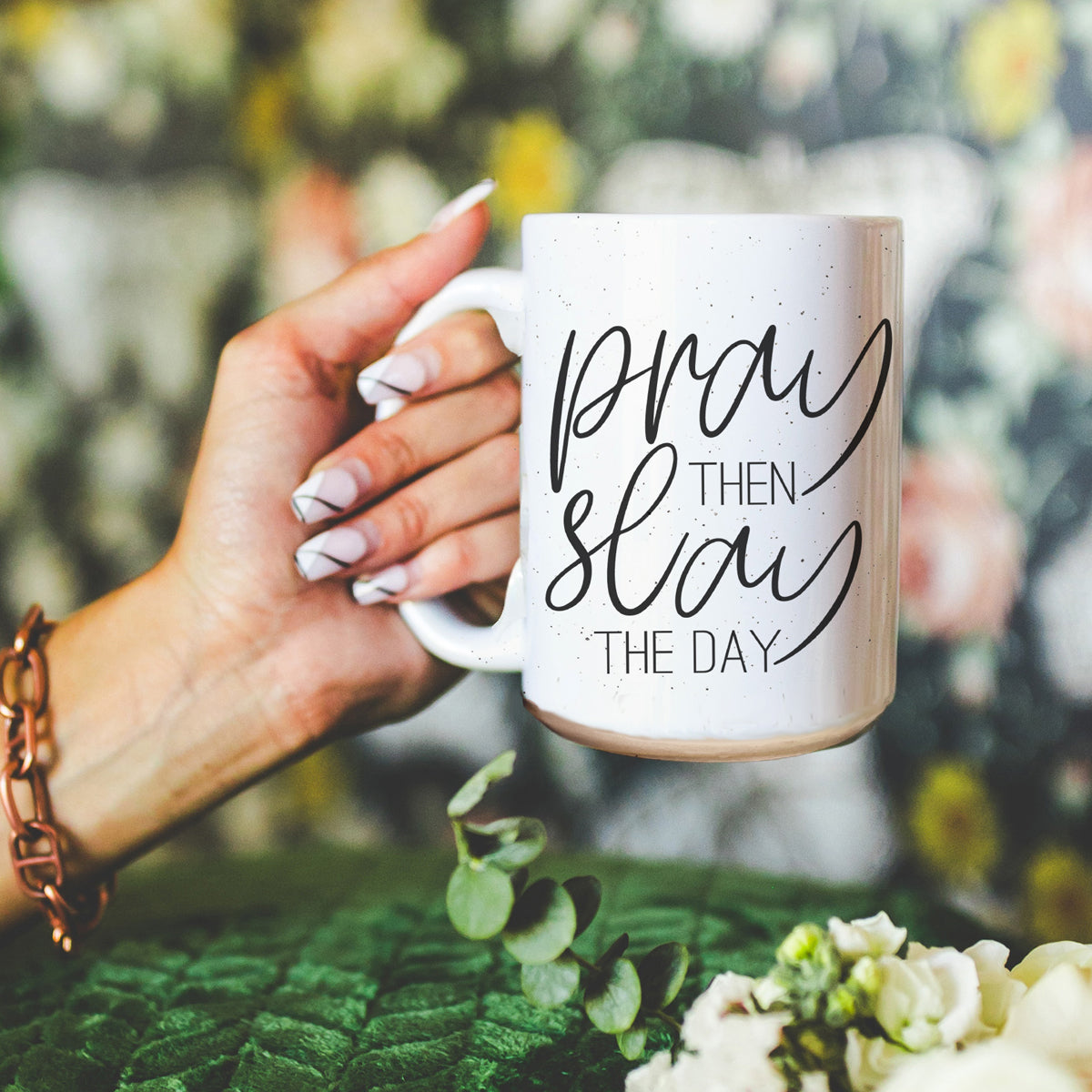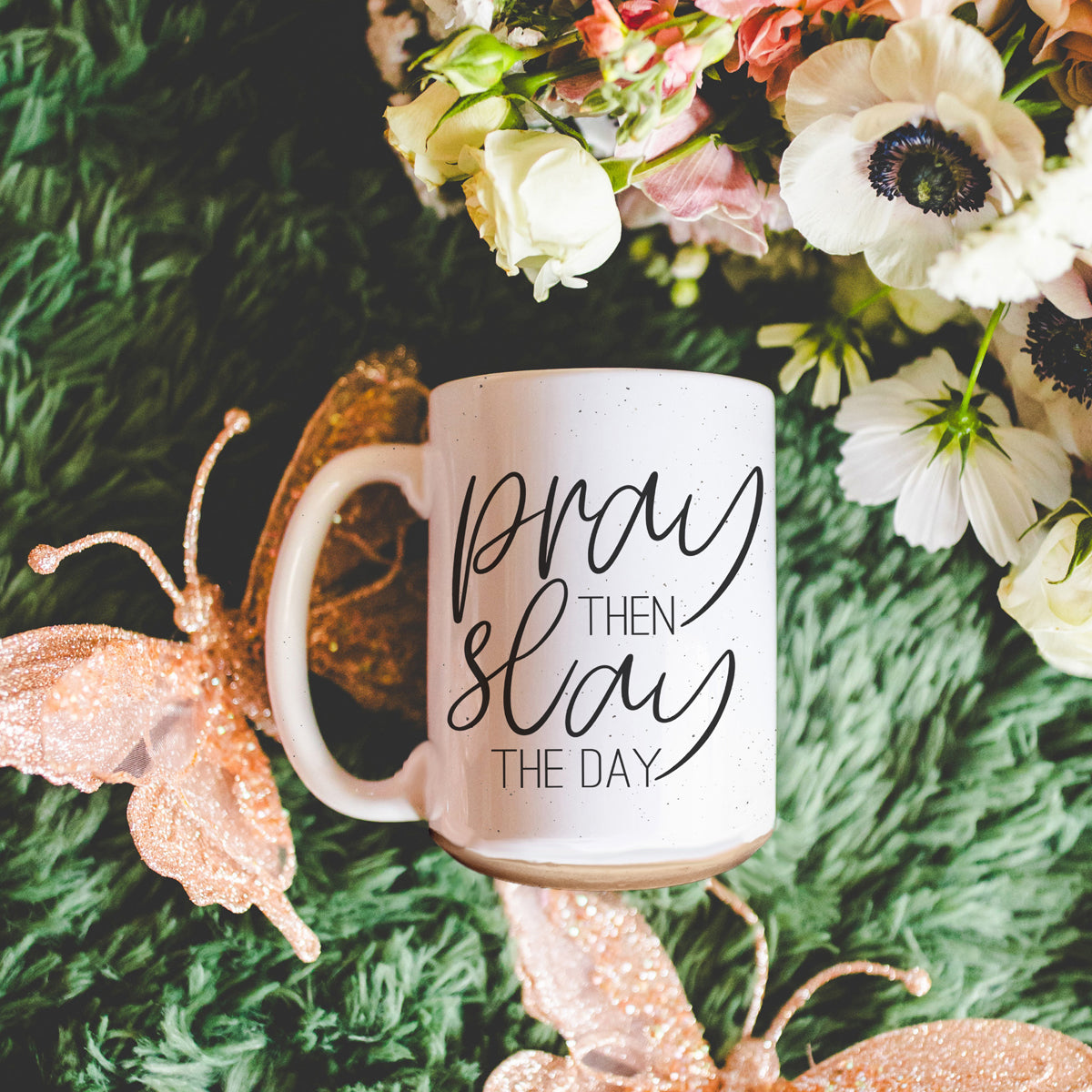 So why settle for ordinary when you can start your day with a dose of inspiration? Embrace the power of prayer and the thrill of triumph with our "Pray Then Slay the Day" Ceramic Mug. Because when you combine faith with determination, there's nothing you can't achieve. So go ahead – pray, then slay the day like the boss you are!