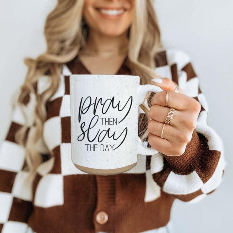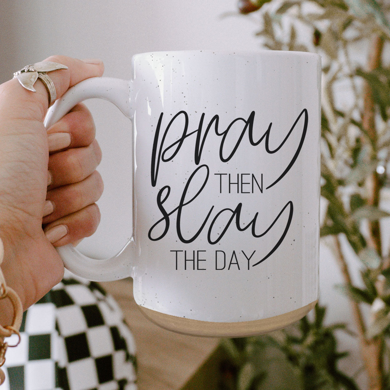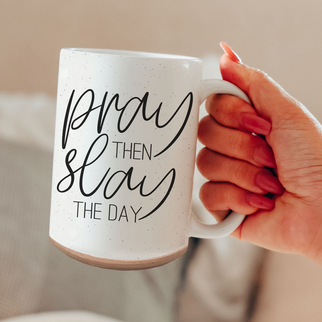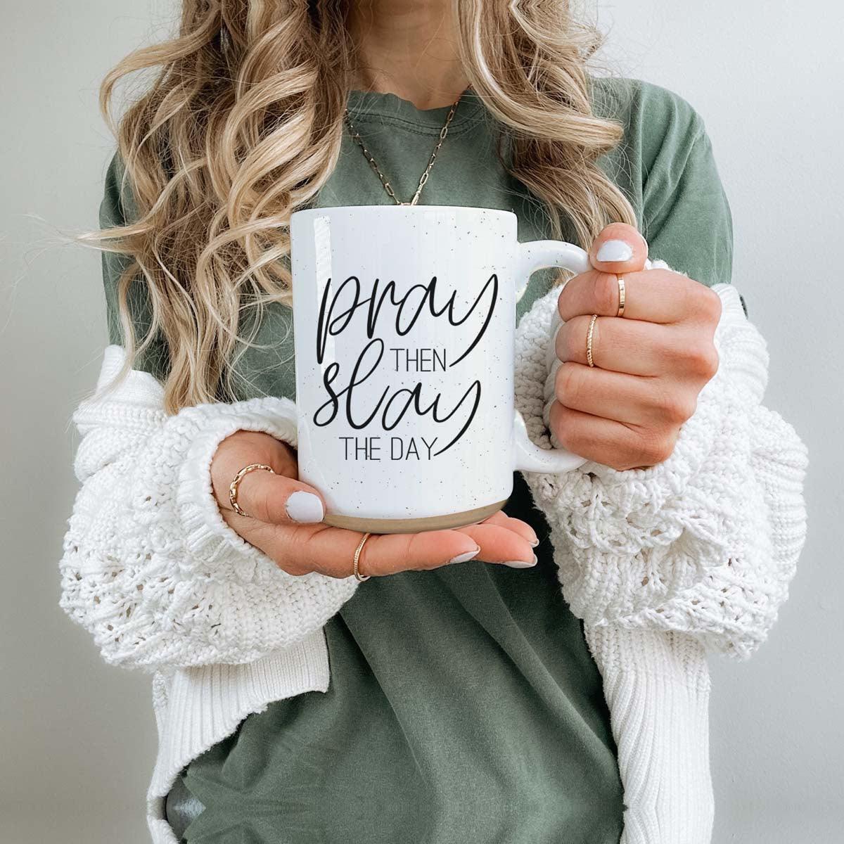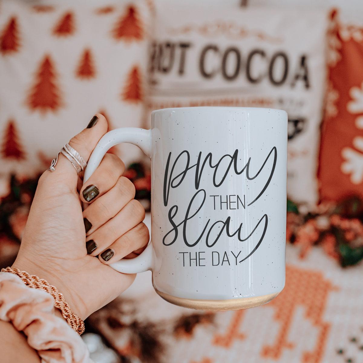 So why settle for ordinary when you can start your day with a dose of inspiration? Embrace the power of prayer and the thrill of triumph with our "Pray Then Slay the Day" Ceramic Mug. Because when you combine faith with determination, there's nothing you can't achieve. So go ahead – pray, then slay the day like the boss you are!