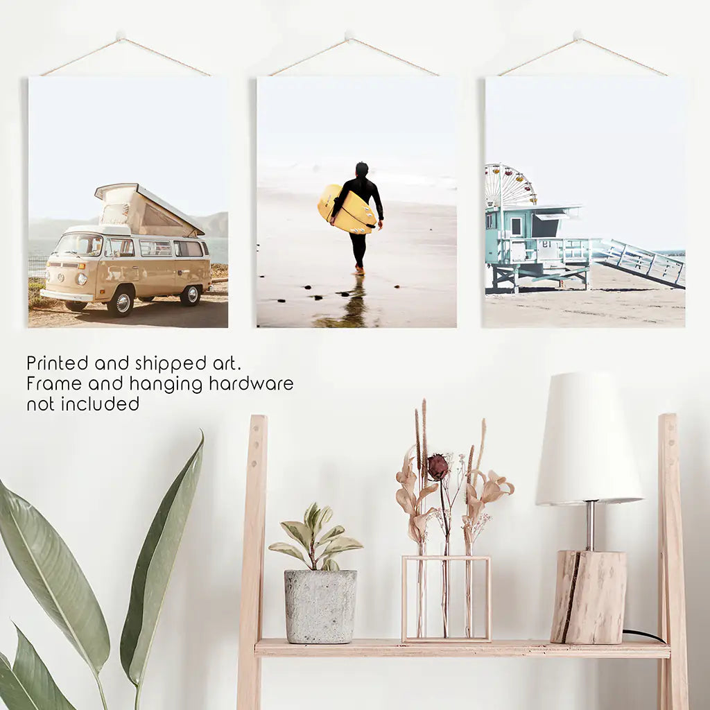 Surfer on the Sand Wall Art Set. Yellow Bus, Lifeguard Tower